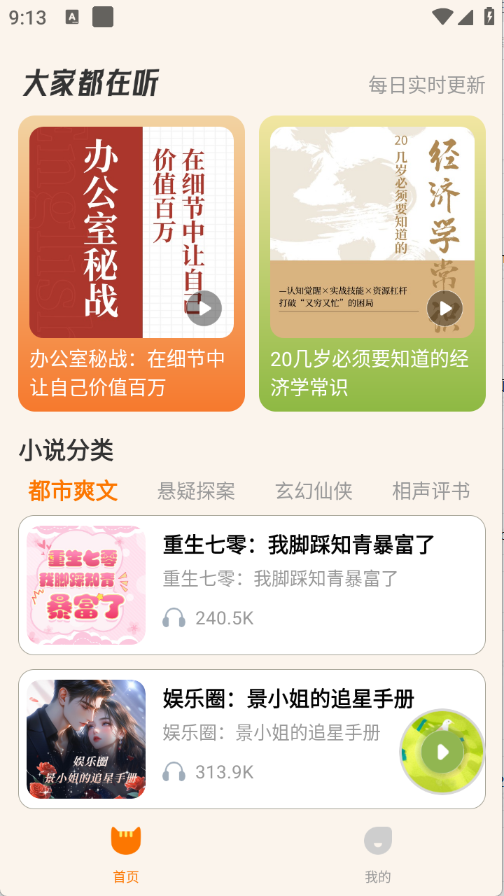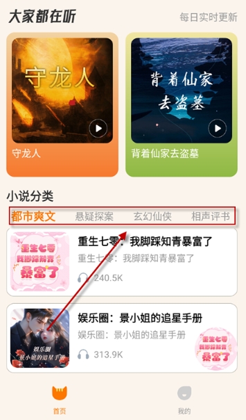 2、首页有很多的小说资源,悬疑探案、相声评书以及玄幻仙侠等类型