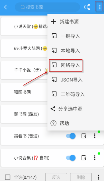 3、点击右上角的三个点,软件提供多种导入方式。以网络导入为例,点击“网络导入”选项